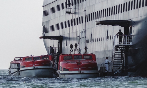Passengers of Holland America's cruise ship Zaandam are transferred to the Rotterdam cruise ship in Panama City bay on Saturday. Panama's maritime authority said earlier on Saturday that healthy passengers were being evacuated from the Zaandam to another liner, the Rotterdam. Photo: AFP