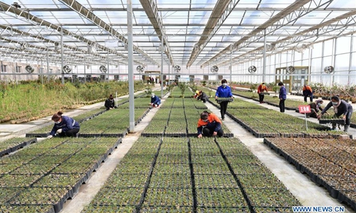 Farmers work in a seedling greenhouse at an agricultural garden in Luanzhou City, north China's Hebei Province, March 29, 2020.Photo:Xinhua