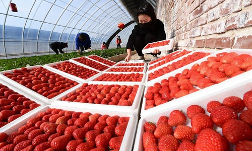 A farmer packs strawberries in a greenhouse at an agricultural garden in Luanzhou City, north China's Hebei Province, March 29, 2020.Photo:Xinhua