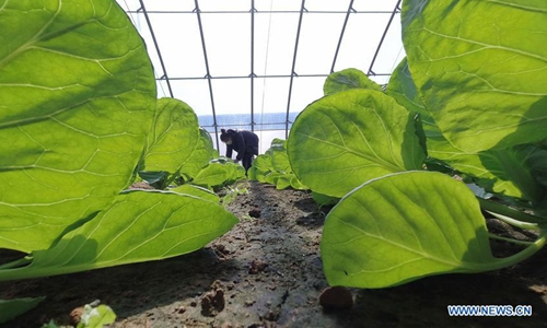 A farmer works in a greenhouse at an agricultural garden in Luanzhou City, north China's Hebei Province, March 29, 2020. Photo:Xinhua