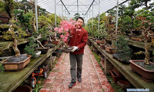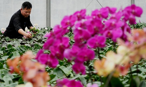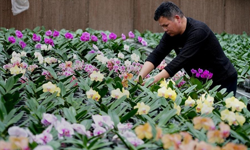 A man works at a flowers and trees planting company in Huangchuan County, central China's Henan Province, March 29, 2020. In recent years, flowers and trees planting industry has developed quickly in Huangchuan County. Up till now, the industry has involved more than 100,000 villagers here, helping over 1,000 families shake off poverty. Photo:Xinhua
