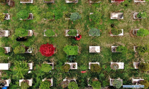 Aerial photo taken on March 29, 2020 shows workers pruning potted plant at a flowers and trees planting company in Huangchuan County, central China's Henan Province. In recent years, flowers and trees planting industry has developed quickly in Huangchuan County. Up till now, the industry has involved more than 100,000 villagers here, helping over 1,000 families shake off poverty. Photo:Xinhua