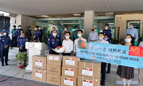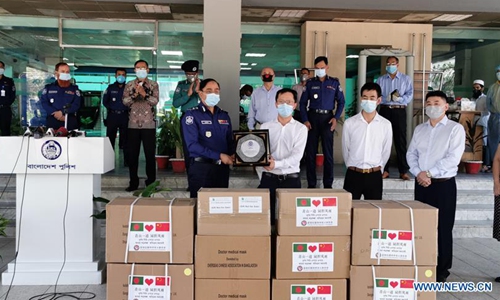 Representatives of Overseas Chinese Association in Bangladesh (OCAIB) hand over donations of medical supplies to Bangladesh Police in Dhaka, Bangladesh on March 29, 2020. OCAIB has made donations of medical supplies to support Bangladesh Police in fighting COVID-19 in the country. The supplies including medical masks, medical protective clothing and testing reagents, were handed over to Inspector General of Bangladesh Police Mohammad Javed Patwary by President of the Overseas Chinese Association in Bangladesh Zhuang Lifeng during a ceremony on Sunday in Dhaka. (Xinhua)