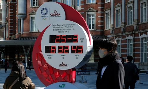 People walk past an electronic Tokyo Olympic Games countdown clock showing the day’s date and local time instead of the countdown days in Tokyo on Wednesday. Photo: VCG