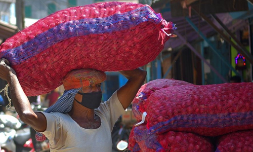 A labour carries a gunny bag containing onions during the lockdown due to the COVID-19 outbreak in the outskirts of Agartala, India's northeast state of Tripura, March 30, 2020. (Str/Xinhua)