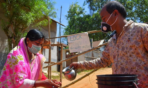 A villager washes her hands before entering a village during the lockdown due to the COVID-19 outbreak in the outskirts of Agartala, India's northeast state of Tripura, March 30, 2020. (Str/Xinhua)