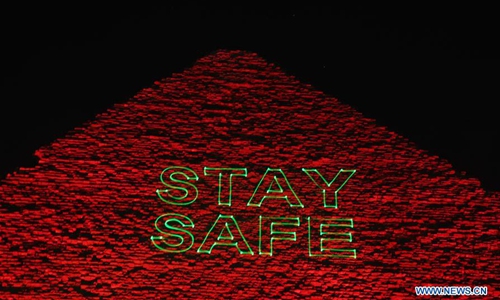 Photo taken on March 30, 2020 shows the view of the Pyramid of Khufu illuminated with text "Stay safe" in Giza, Egypt. (Str/Xinhua)