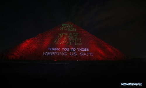 Photo taken on March 30, 2020 shows the view of the Pyramid of Khufu illuminated with text "Stay home, stay safe, thank you to those keeping us safe" in Giza, Egypt. (Str/Xinhua)