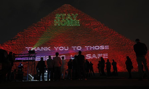 People gather near the Pyramid of Khufu illuminated with text "Stay home, thank you to those keeping us safe" in Giza, Egypt. (Str/Xinhua)