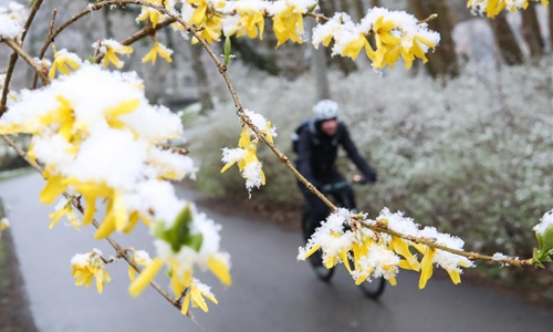 A man rides a bicycle at a park after snow in Berlin, capital of Germany, March 30, 2020. (Xinhua/Shan Yuqi)