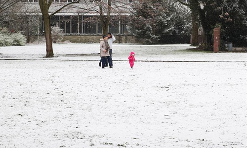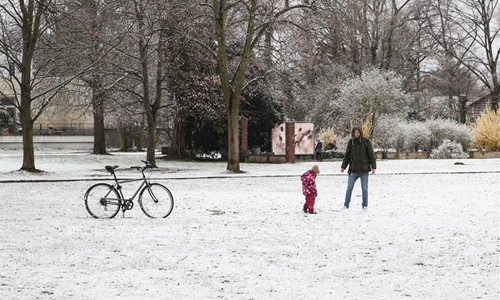 People walk on grass covered by snow at a park in Berlin, capital of Germany, March 30, 2020. (Xinhua/Shan Yuqi)