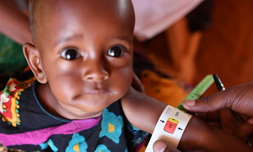 A file photo shows an acute malnourished child is measured the arm perimeter by a UNICEF staff inside the IDP camp in Doolow, a border town with Ethiopia, in Somalia, on March 20, 2017. (Xinhua/Sun Ruibo)