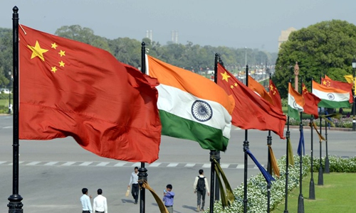 Indian and Chinese national flags flutter side by side at the Raisina hills in New Delhi, India, on Sept. 16, 2014. (Xinhua/Partha Sarkar)