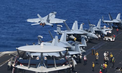 A US FA-18 Hornet fighter jet flies past fighter jets and E-2C Hawkeyes during a routine training aboard US aircraft carrier Theodore Roosevelt in the South China Sea on Tuesday. The carrier group is transiting through the South China Sea on its way to the Philippines from Singapore after participating in Operation Inherent Resolve (OIR) and Operation Freedom’s Sentinel (OFS) in Syria, Iraq and Afghanistan. Photo: AFP