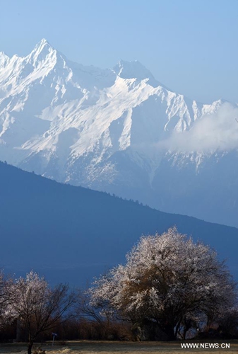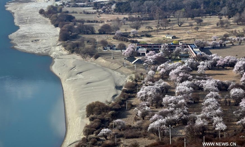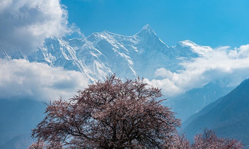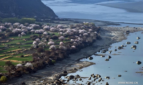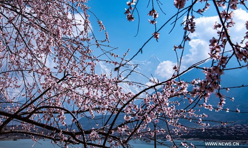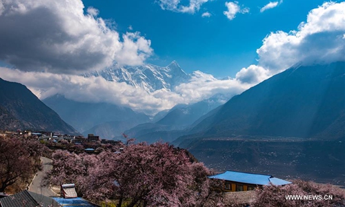 Photo taken on April 1, 2020 shows peach blossoms along the Yarlung Zangbo River Grand Canyon, known as the world's deepest canyon, in southwest China's Tibet Autonomous Region. (Xinhua/Huang Huo)