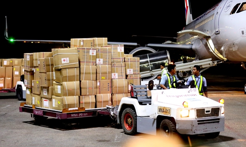 Airport workers unload medical supplies from China in Yangon, Myanmar on Friday. A batch of Chinese government aid products to fight the COVID-19 arrived in Yangon on Thursday evening. Photo: Xinhua