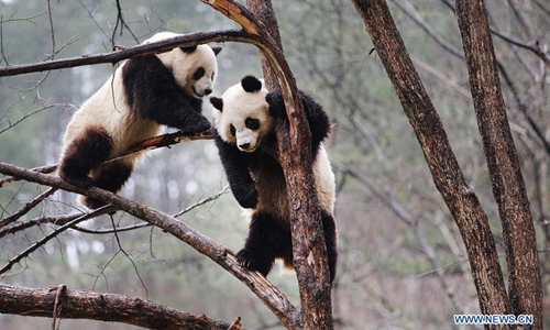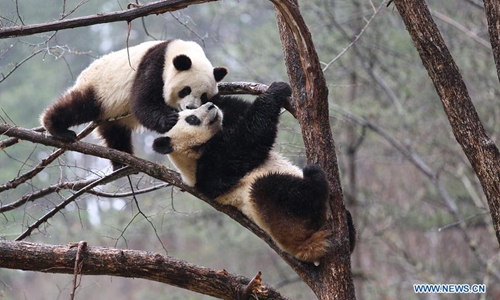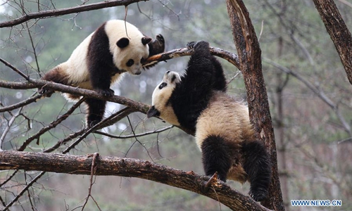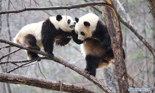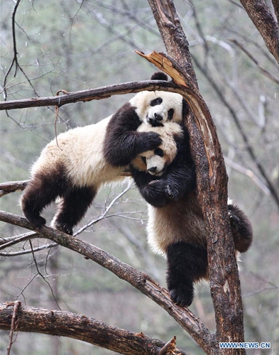 Giant pandas "Lulu" (R) and "Xiaoxin" frolic on a tree in the Qinling Wild Panda Training Base at Foping Nature Reserve, northwest China's Shaanxi Province, April 2, 2020. (Photo by Pu Zhiyong/Xinhua)