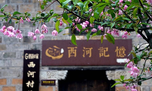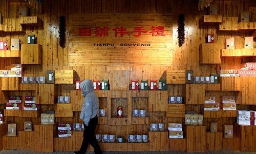 Photo taken on March 27, 2020 shows the view of a souvenir shop at Tianpudawan village in Xinxian County of Xinyang City, central China's Henan Province. In recent years, guided by the conviction that "lucid waters and lush mountains are invaluable assets", Xinyang City has promoted its rural revitalization through shaping a batch of beautiful and characteristic villages in a well-coordinated manner. (Xinhua/Li An)