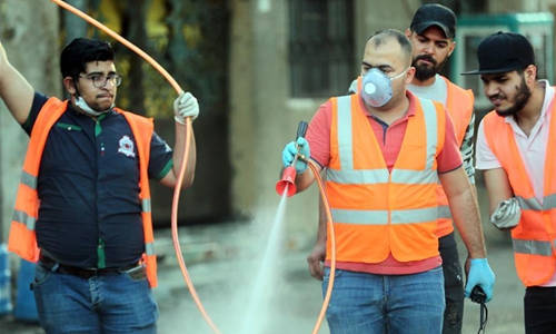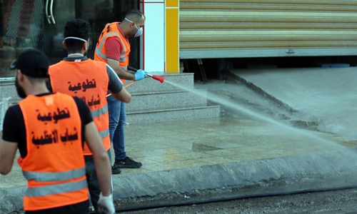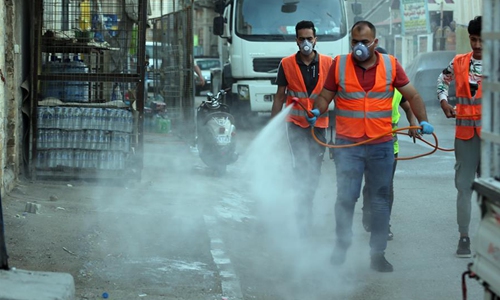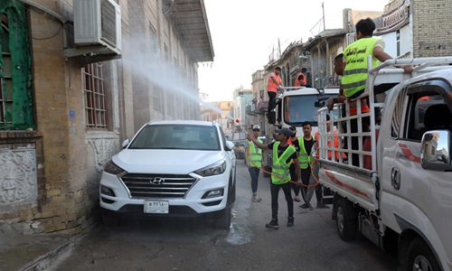 Volunteers sterilize a street in Baghdad, Iraq, on April 4, 2020. Iraqi Health Ministry on Saturday confirmed two more deaths from COVID-19 and 58 new cases, as the total number of infections climbed to 878. (Xinhua/Khalil Dawood)