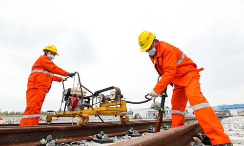 Workers work at the construction site of Metro Line 5 in Wuhan, central China's Hubei Province, March 31, 2020. Wuhan Metro Line 5 has resumed construction since March 23. (Photo by Jin Wei/Xinhua)