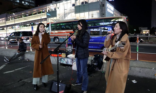 Ayaka Nakata (C) sing a Japanese version of a Chinese anti-epidemic charity song with her friends on the Tokyo street. (Photo courtesy of Ayaka Nakata)