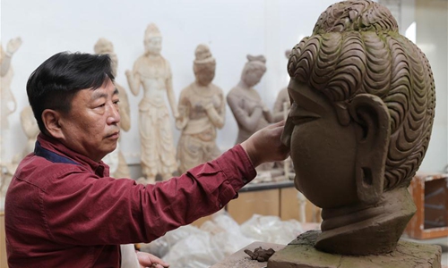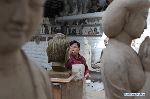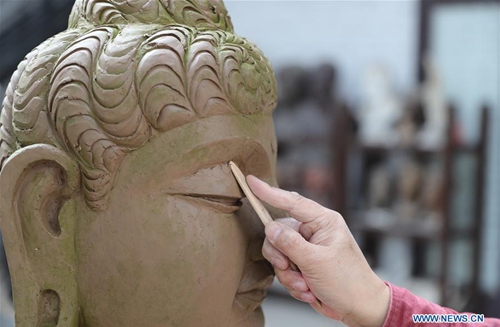 Painted sculpture artist Du Yongwei perfects the detail of a clay model before painting in Dunhuang, northwest China's Gansu Province, April 5, 2020. Painted sculpture art is a traditional art form in Dunhuang and the craftsmanship has been inscribed in the provincial cultural heritage list of Gansu. Du Yongwei, 60, has been working in the field for over 40 years. He has started training class for youngsters to learn the art. (Xinhua/Du Zheyu)