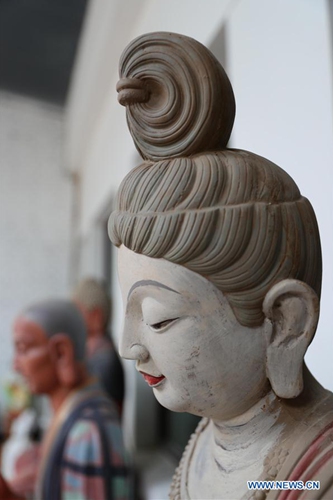 Painted sculptures created by Du Yongwei are on display at his studio in Dunhuang, northwest China's Gansu Province, April 5, 2020. Painted sculpture art is a traditional art form in Dunhuang and the craftsmanship has been inscribed in the provincial cultural heritage list of Gansu. Du Yongwei, 60, has been working in the field for over 40 years. He has started training class for youngsters to learn the art. (Xinhua/Du Zheyu)