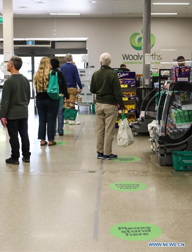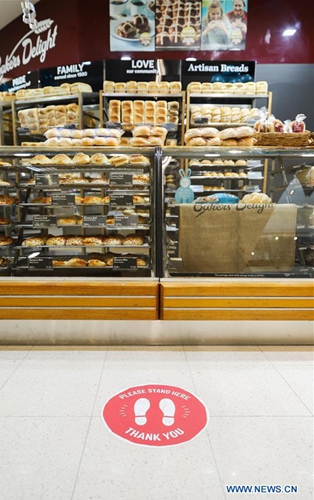 Photo taken on April 6, 2020 shows social distancing signs on the ground in a supermarket in Canberra, Australia. (Photo by Liu Changchang/Xinhua)