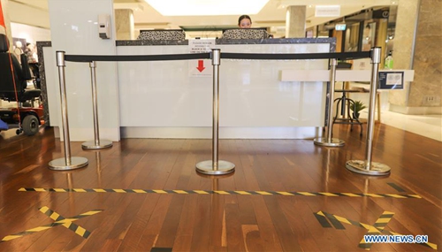 Photo taken on April 6, 2020 shows a social distancing sign on the ground in a shopping mall in Canberra, Australia. (Photo by Liu Changchang/Xinhua)