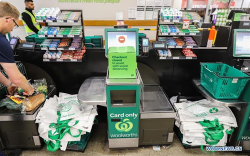 Photo taken on April 6, 2020 shows half of the self-checkout machines closed to help customers keep social distance in a supermarket in Canberra, Australia. (Photo by Liu Changchang/Xinhua)