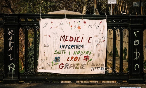 A piece of cloth with words "Doctors and nurses, you are our heroes" is seen on a fence in Turin, Italy, on April 4, 2020. lives. Photo: Xinhua