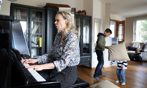 German sopranist Lilli Wuenscher sings as her 10-year-old son Joshua and 3-year-old daughter Josephine have a pillow fight at their home on Friday. Photo: AFP