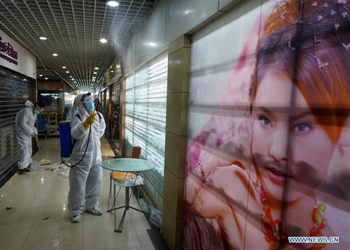 Staff members disinfect a small commodities market before business resumption at the Hanzheng Street commercial and trade area, in Wuhan, central China's Hubei Province, April 6, 2020. For days, local authorities have organized people to prepare for work and business resumption here. (Xinhua/Wang Yuguo)