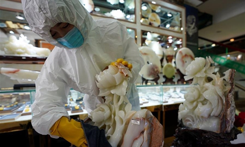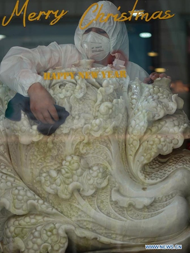A staff member of a jewelry store cleans jade arttifacts before business resumption at the Hanzheng Street commercial and trade area, in Wuhan, central China's Hubei Province, April 6, 2020. For days, local authorities have organized people to prepare for work and business resumption here. (Xinhua/Wang Yuguo)