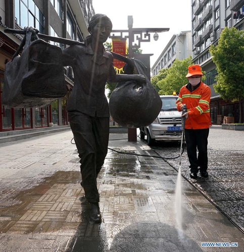 A sanitation worker washes roads at the Hanzheng Street commercial and trade area, in Wuhan, central China's Hubei Province, April 6, 2020. For days, local authorities have organized people to prepare for work and business resumption here. (Xinhua/Wang Yuguo)
