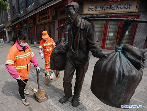 Sanitation workers clean roads at the Hanzheng Street commercial and trade area, in Wuhan, central China's Hubei Province, April 6, 2020. For days, local authorities have organized people to prepare for work and business resumption here. (Xinhua/Wang Yuguo)