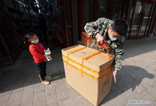 An owner of a toy store packs goods for a customer at the Hanzheng Street commercial and trade area, in Wuhan, central China's Hubei Province, April 6, 2020. For days, local authorities have organized people to prepare for work and business resumption here. (Xinhua/Wang Yuguo)
