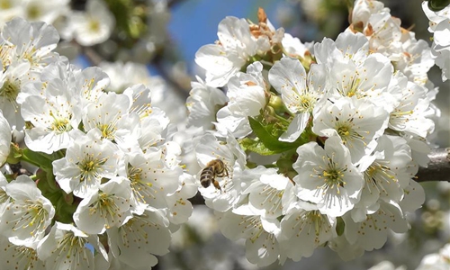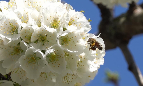 A bee flies around a blooming tree in Budapest, Hungary, April 7, 2020. (Photo by Attila Volgyi/Xinhua)