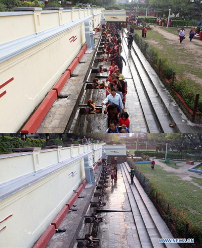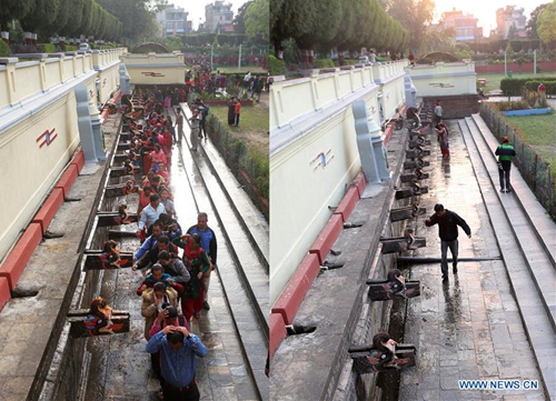 Combo picture shows people taking holy bath during the Baishak Asnan festival on April 19, 2019 (above) and people offering prayers with holy water to mark the Baishak Asnan festival amid the lockdown on April 8, 2020 at Balaju in Kathmandu, Nepal. It is believed that taking a holy bath purifies one spiritually and makes him free from skin diseases. On Monday, Nepal's cabinet had extended the ongoing lockdown until April 15. (Photo by Sunil Sharma/Xinhua)
