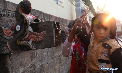 A child is guided by his mother to offer prayers to mark the Baishak Asnan festival amid the lockdown at Balaju in Kathmandu, Nepal on April 8, 2020. It is believed that taking a holy bath purifies one spiritually and makes him free from skin diseases. On Monday, Nepal's cabinet had extended the ongoing lockdown until April 15. (Photo by Sunil Sharma/Xinhua)