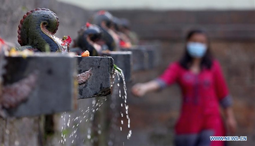A woman wearing a face mask arrives to offer prayers to mark the Baishak Asnan festival amid the lockdown at Balaju in Kathmandu, Nepal, April 8, 2020. It is believed that taking a holy bath purifies one spiritually and makes him free from skin diseases. On Monday, Nepal's cabinet had extended the ongoing lockdown until April 15. (Photo by Sunil Sharma/Xinhua)