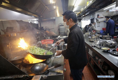 A chef prepares food inside the kitchen for the frontline workers of Vancouver General Hospital at a Chinese restaurant in Vancouver, Canada, April 6, 2020. The Canadian government is recruiting volunteers to support frontline healthcare workers to combat the COVID-19 crisis. Some local Chinese restaurants donated meals to the frontline healthcare workers fighting COVID-19. (Photo by Liang Sen/Xinhua)