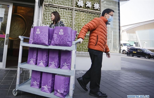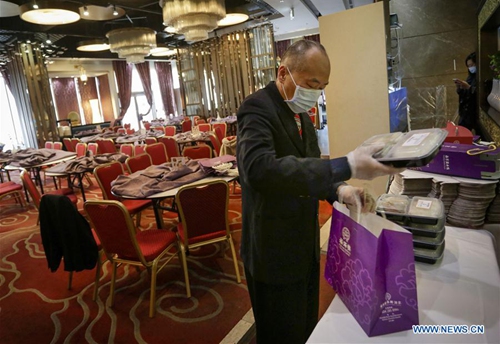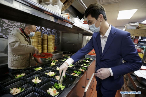 A staff member of a Chinese restaurant prepares meal boxes inside the kitchen for the frontline workers of Vancouver General Hospital in Vancouver, Canada, April 6, 2020. The Canadian government is recruiting volunteers to support frontline healthcare workers to combat the COVID-19 crisis. Some local Chinese restaurants donated meals to the frontline healthcare workers fighting COVID-19. (Photo by Liang Sen/Xinhua)