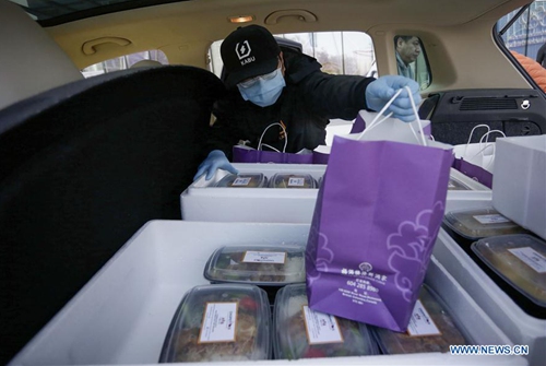 A worker helps load the meal for donation into a car and delivers to Vancouver General Hospital in Vancouver, Canada, April 6, 2020. The Canadian government is recruiting volunteers to support frontline healthcare workers to combat the COVID-19 crisis. Some local Chinese restaurants donated meals to the frontline healthcare workers fighting COVID-19. (Photo by Liang Sen/Xinhua)