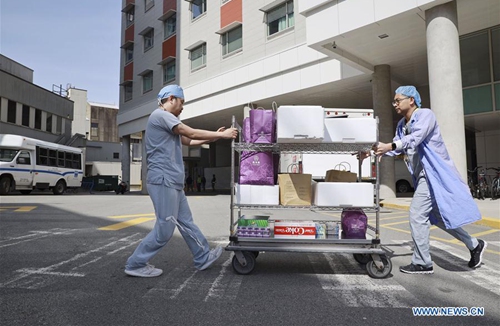 A worker transports meals for donation to the frontline healthcare workers of Vancouver General Hospital in Vancouver, Canada, April 6, 2020. The Canadian government is recruiting volunteers to support frontline healthcare workers to combat the COVID-19 crisis. Some local Chinese restaurants donated meals to the frontline healthcare workers fighting COVID-19. (Photo by Liang Sen/Xinhua)