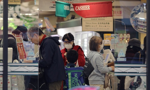 Customers check out at a supermarket in Shinagawa-ku, Tokyo, Japan, April 8, 2020. (Xinhua/Du Xiaoyi)