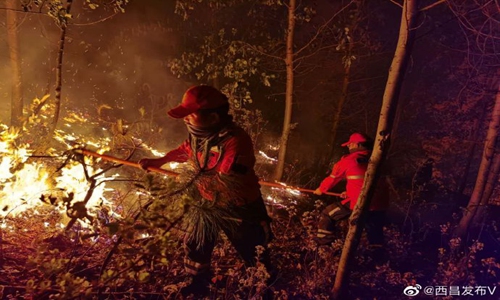 The forest fire started on a local farm at 3 on March 30, 2019, in Xichang county, Southwest China's Sichuan Province. Photo: Xichang government
