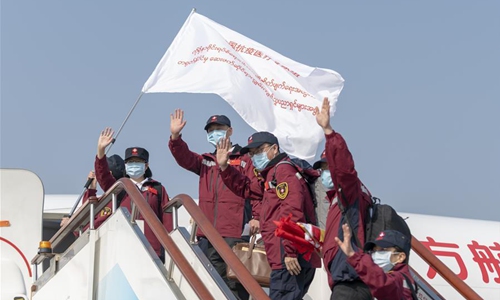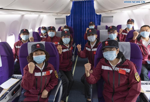 Members of a medical team assisting the Myanmar government's efforts in fight against COVID-19 board the plane before departure at the Kunming Changshui International Airport in Kunming, southwest China's Yunnan Province, April 8, 2020. The Chinese government has sent a team of medical experts to Myanmar to help the country cope with the COVID-19 epidemic, Foreign Ministry spokesman Zhao Lijian announced Wednesday. The team, organized by the National Health Commission, consists of 12 experts selected by the health commission of Yunnan Province. The team left for Myanmar earlier in the day, Zhao said. (Photo by Chen Xinbo/Xinhua)