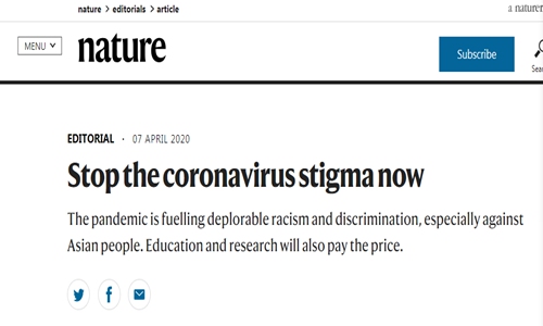 In the editorial entitled "Stop the coronavirus stigma now," Nature wrote that the World Health Organization (WHO) was implicitly sending a reminder to those who had erroneously associated the virus with Wuhan and with China in their news coverage - including Nature.