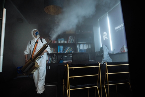 Zhang Lili from the market has five bottles of disinfectant at the counter next to the entrance door of her shop. "Every customer will be soaked with alcoholic disinfectant before entering."